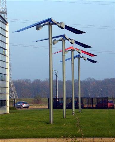Industrieterrein De Brand. Vier masten met bewegende 'vleugels', waarin vogels te herkennen zouden zijn.