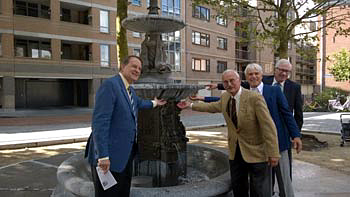 De panden Wolvenhoek 10-12 werden in 1930 aangekocht door de firma dr. Lammers en dr. Indemans. Het grote pand was echter toch te klein om het hele bedrijf onderdak te bieden. Dat was de reden om in de tuin een magazijn te bouwen. Hierbij kwam de fontein in de verdrukking. De firma besloot daarop de fontein aan het gemeentebestuur aan te bieden. In een voorstel aan de gemeenteraad van 19 oktober 1931 stelden B&W de gemeenteraad voor te besluiten tot: „onder dankzegging te aanvaarden de door de NV Chemische en Pharmaceutische Fabriek en Groothandel in ziekenverplegingsartikelen 'dr. Lammers en dr. Indemans' alhier gedane schenking, bestaande uit een hardstenen fontein.” Sommige leden van de gemeenteraad, beducht voor de kosten van de overplaatsing, waren niet zo enthousiast over de schenking.