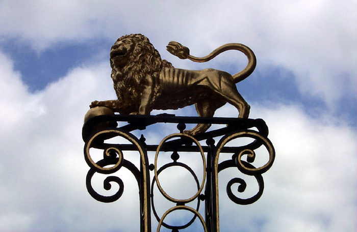 Een, voor het pand Schapenmarkt 4 geplaatste 18e eeuwse kolom met daarop zich bevindende vergulde gebeeldhouwde leeuw. |