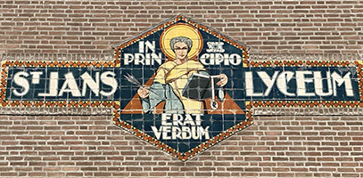 HomeruslaanOntworpen door Jan Stuyt 1923 voor de zuidgevel van het St. Janslyceum in de St. Josephstraat / In de Boerenmouw / Hinthamerstraat 74. Na de sloop van dit gebouw rond 1990 werd deze gevelversiering behouden en nadien overgebracht naar het nieuwe gebouwde St. Janslyceum op Zuid, Sweelinckplein 3, 's-Hertogenbosch. Voorstelling: de evangelist Johannes met schrijfveer, boek en adelaar symbool aan het lint. Met de eerste woorden van zijn evangelie in het Latijn:In principio erat verbum (= In den beginne was het Woord). |