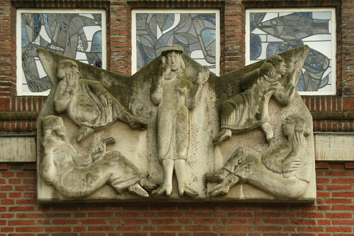 Telecommunicatiegebouw van de P.T.T., Prins Bernhardstraat 12afmetingen: 215 x 110 cmmateriaal: natuursteen datering: 1955-1956 vervaardigd door: Niel Steenbergen Afgebeeld zijn vijf 'telefonerende', weinig gedetailleerde, vrouwlijke figuren. Hun houdingen en gebaren zijn expressief en enigszins onnatuurlijk. Op de bouwtekening van 1953 was de vorm van het reliëf reeds ingetekend, in 1954 begon men met de bouw en in 1956 is het in gebruik genomen.115 De kunstenaar Niel Steenbergen kreeg eind 1954 de opdracht tot het maken van een ingangsreliëf in het kader van de rijkspercentage regeling.116 | 63 |