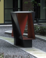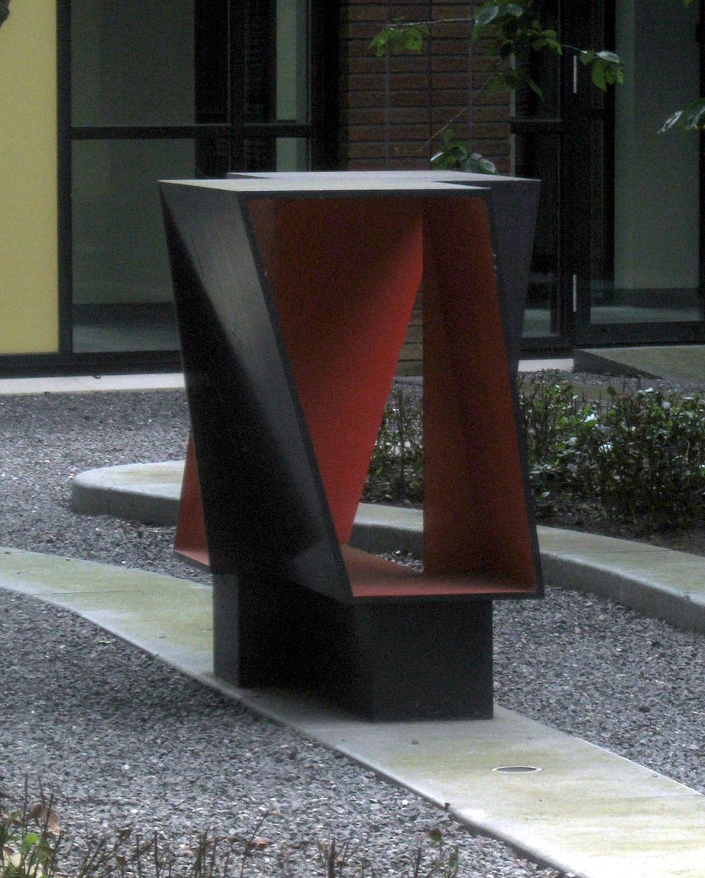 De indruk die dit beeld maakt hangt sterk af van het standpunt van waaruit het wordt waargenomen: het ene moment lijkt het massief, volumineus en robuust. Vanuit een andere hoek gezien resteert niet meer dan een ijl en doorzichtig frame. Als een kader rondom een uitsnede van de omliggende binnentuin. Het beeld herbergt een schuilplaats voor de kijker.