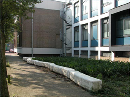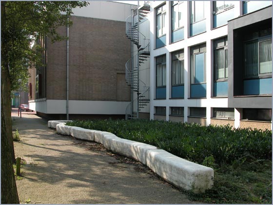 Carolushofafmetingen: (zes elementen) ca 250 x 45 x 45 cmmateriaal: beton Datering 1985 Vervaardigd Joep van Opstal Omgevingskunstwerk bestaande uit zes licht gebogen, wit geschilderde elementen van beton. Het element aan een van de uiteinden is zo gebogen dat het een halve cirkel vormt als een soort afsluiting. Ze vormen met enkele onderbrekingen een richel langs het voetpad en zijn zodanig geïntregeerd in de omgeving dat het als kunstwerk nauwelijks opvalt. Het kunstwerk is tot stand gekomen door een gemeentelijke opdracht zonder buurtinspraak, daar het een nieuwbouwwijk betrof. | 100 |
