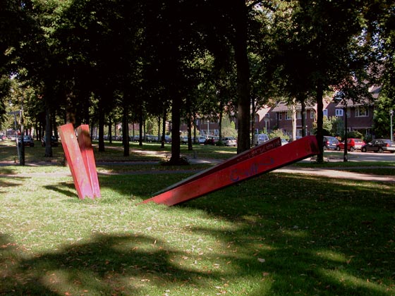 Geldersedam / hoek W. van Nassaulaanafmetingen: (korte balken) 190 x 20 x 30 cm; (lange balken) 540 x 20 x 30 cmmateriaal: staal, rood gespoten datering: 1986 vervaardigd door: John van Nistelrooy Vier symmetrisch opgestelde rode stalen balken die met een uiteinde in het gras steken. De twee korte staan bijna verticaal en de twee lange zijn bijna horizontaal geplaatst. Het kunstwerk is tot stand gekomen in opdracht van de gemeente in het kader van de stadverfraaiing. | 103 |