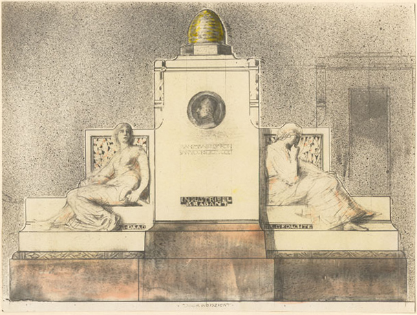InleidingGedenkteken gelegen in de zuidelijke punt van het voorplein van het voormalige Gouvernement. Het op 28 maart 1921 onthulde monument, dat invloeden vertoont van de Neo-Renaissance, werd ontworpen door drie verschillende kunstenaars. De algehele opzet en de beeltenis in de centrale medaillon werden ontworpen door Huib Luns, de toenmalige directeur van de school voor kunst, techniek en ambacht in Den Bosch; August Falise maakte het model van de vrouwenfiguren aan weerszijden en de Bossche beeldhouwer Jac. Goossens werkte tenslotte het geheel in steen uit (de namen van de uitvoerenden staan vermeld op de zijkant van het middendeel).Het beeld werd aangeboden door een comité van Brabantse industriëlen ter gelegenheid van het 25-jarig ambtsjubileum in 1919 van de commissaris van de koningin, mr. A.E.J. baron van Voorst tot Voorst. Tijdens zijn commissariaat, van 1894 tot 1928, ontwikkelde Brabant zich van een overwegend agrarisch gewest tot een beginnende industriële samenleving. OmschrijvingHet symmetrische, vrijstaande gedenkteken bestaat uit een hoog middendeel op vierkant grondplan en twee lagere vleugels op rechthoekig grondplan, alle op een granieten sokkel. Centraal in het middendeel aan de voorzijde een bronzen medaillon met de omlauwerde beeltenis van de commissaris waaronder de inscripties:mr. A.E.J. BARON VAN VOORST TOT VOORST COMMISSARIS DER KONINGIN 1894 1SEPT 1919 INDUSTRIEEL Nrd BRABANT Aan de achterzijde binnen een decoratieve omlijsting en onder de Brabantse leeuw een bronzen plaquette waarop de namen van de leden van het comité. In het bovenste deel op de randen decoratief beitelwerk. Het middendeel wordt bekroond met een gestileerde bijenkorf, symbool van de nijverheid. Ter linker zijde de personificatie van 'De Gedachte' (onderschrift), een in gedachten verzonken vrouwenfiguur in geplooid gewaad en blootvoets met als attribuut een boek en tegen een omrand achtergrondtableau waarop laurierbladeren. Zij representeert de leiding der industrie. Ter rechterzijde de personificatie van 'De Daad' (onderschrift), eveneens in geplooid gewaad en blootvoets met als attributen een hamer en een tandrad tegen een omrand achtergrondtableau waarop eikenbladeren. Zij representeert de industriearbeiders. WaarderingHet gedenkteken is van algemeen belang. Het object heeft cultuurhistorische waarden als bijzondere uitdrukking van de industriële ontwikkeling van Brabant tussen 1894 en 1919. Het object heeft kunsthistorische waarde wegens de esthetische kwaliteiten van het ontwerp. Het object heeft ensemblewaarde wegens de historische relatie met het belendende voormalige Gouvernement.Het object is van belang wegens de gaafheid en bezit zeldzaamheidswaarde op grond van het drievoudige kunstenaarschap. |