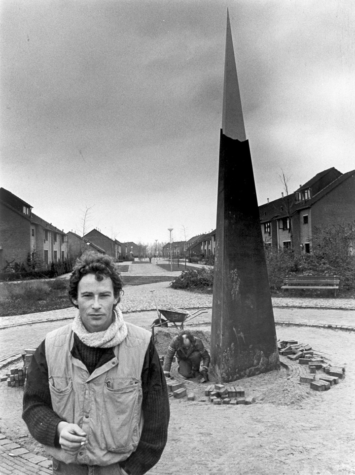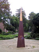 Lokeren in de wijk Maaspoortafmetingen: (zijde aan de grond) 35 x 550 cmmateriaal: cortenstaal, plaatstaal, bladgoud datering: 1985 vervaardigd door: Gerard Hendriks Het is een smalle piramide van Cortenstaal met een plaatstaal en bladgoud beklede punt van ca 150 cm hoog. Het kunstwerk kwam tot stand door een opdracht via de B.K.R. van de gemeente in het kader van de stadsverfraaiing. | 102 |