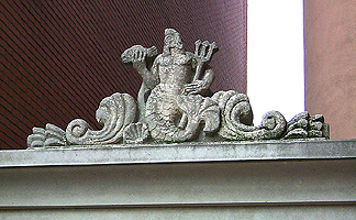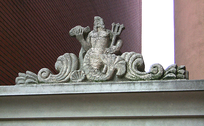 Beeld van de kunstenaar J. Uiterwaal voorstellende Neptunus boven de ingang van het gebouw rechts van het station.