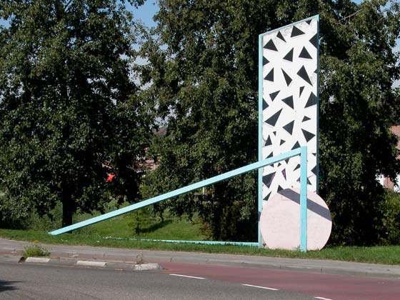 Maaspoort / hoek Fleringen, in het grasafmetingen: 1100 x 600 x 600 cmmateriaal: beschilderd beton, beschilderde stalen balken, staalkabel datering: 1987 vervaardigd door: Yolande Verwoerd Een verticaal, wit/zwart/grijs geschilderd element van beton, een roze metalen schijf, geplaatst in een zeegroen geschilderde stalen balkenconstructie. Dit kunstwerk is geplaatst in opdracht van de gemeente 's-Hertogenbosch in het kader van de stadsverfraaiing. | 109 |