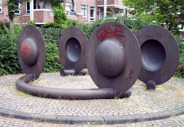 Statenkwartier, in de wijk Maaspoortafmetingen: (dikte balken) 25 x 21 cm; (doorsnede cirkel) 380 cm; (doorsnede schijven) 150 cmmateriaal: zwartgespoten plaatstaal, stalen balk op bakstenen plateau datering: 1987 vervaardigd door: Dori van Noort Op een cirkelvormig bakstenen verhoging zijn twee ellipsvormige balken in de vorm van twee halve cirkels bevestigd, met een kleine ruimte tussen de vier uiteinden. Op beide balken zijn symmetrisch twee staande stalen schijven bevestigd. De schijven hebben een verdikking in het midden (20 cm), met daar omheen een rand (dikte 1 cm, breed 35 cm). Het kunstwerk is in opdracht van de gemeente geplaatst in het kader van de stadsverfraaiing. | 106 |
