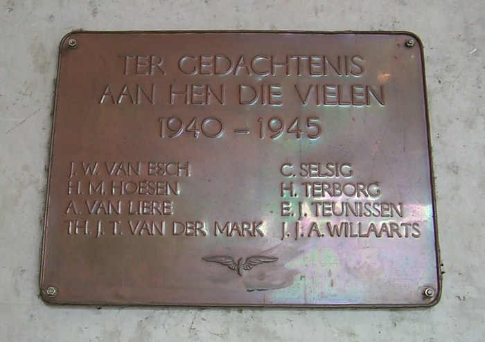 De plaquette in het NS-station te 's-Hertogenbosch is opgericht ter nagedachtenis aan acht personeelsleden van de Nederlandse Spoorwegen die tijdens de bezettingjaren door oorlogshandelingen zijn omgekomen, te weten: J.W. van Esch, H.M. Hoesen, A. van Liere, Th.J.T. van der Mark, C. Selsig en H. Terborg, E.J. Teunissen en J.J.A. Willaarts. Het is een daad van piëteit geweest dat de directie van de Nederlandse Spoorwegen na het einde van de Tweede Wereldoorlog heeft besloten alle omgekomen personeelsleden te gedenken door hun namen te vereeuwigen op identieke plaquettes. De platen werden aangebracht in de diverse stations, behorende tot het district of rayon van de oorlogsslachtoffers. |