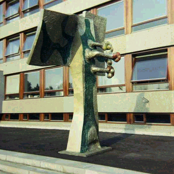 Baden Powellstraat 1, voor de Hogere Agrarische Schoolafmetingen: 320 x 145 x 450 cmmateriaal: aluminium datering: 1968 vervaardigd door: Ad Louwinger Een grijs aluminium object met geruwd oppervlak dat destijds bij de opening van de nieuwbouw voor de ingang geplaatst in het kader van de rijkspercentage-regeling. Nu het object door onbekenden is voorzien van een verflaag, toont het grote overeenkomst met een boom. | 75 |