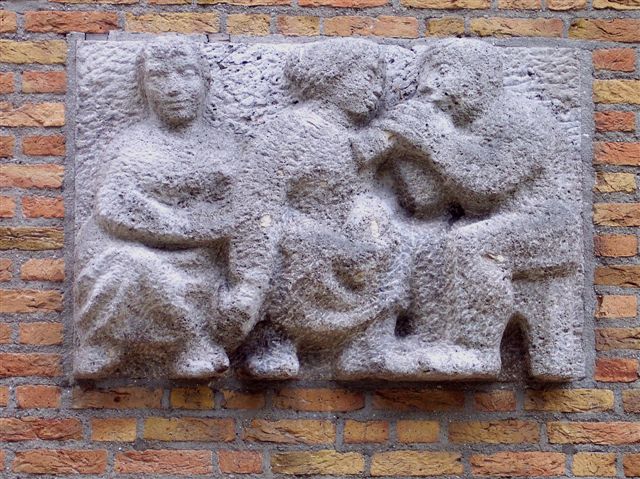 Gregoriussingel 27, in de voorgevelafmetingen: 100 x 72 cmmateriaal: natuursteen datering: 1956 vervaardigd door: Felix van der Linden Dit is een groot, rechthoekig hoogreliëf (13 cm) in een grove, primitieve stijl, waarop musicerende kinderen zijn afgebeeld. Links staan twee luisterende figuren en rechts een fluitspelende figuur. De figuren zijn groot in verhouding tot de afmeting van het blok, maar de (ver)houdingen zijn zodaig aangepast en gedrongen dat ze toch binnen het blok passen. Dit huis was het ouderlijk huis van de beeldhouwer Feliz van der Linden.118 | 65 |