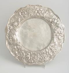 Schotel met brede, ietwat verhoogde, gecontourneerde rand die versierd is met hoog opgedreven bladwerk en bloemen, waaronder tulpen en anemonen.