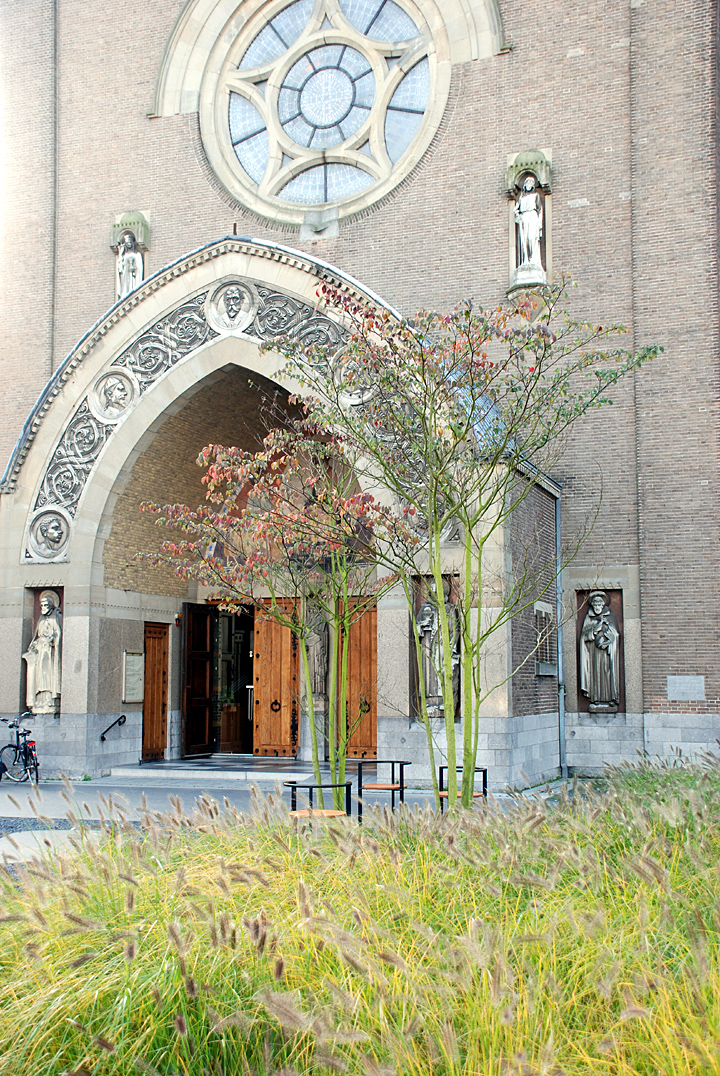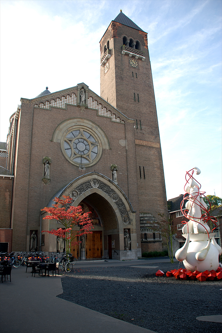 Hinthamerstraat 175, beelden in nissen in de voorgevel; een boog in de voorgevel met tondi en beelden op vier hoeken van de torenafmetingen: (beelden in de voorgevel) 230 cm; (beelden in de toren) 250 cm; (tondi) doorsnede 85 cmmateriaal: natuursteen datering: omstreeks 1918 vervaardigd door: atelier M. van Bokhoven en Jonkers De beelden in de voorgevel zijn statige beelden van een hoekige en strakke vormgeving. Uiterst links beneden staat Theresin van Lisieux (70 x 230 cm) van grijze natuursteen. Het beeld heeft een vlakke achterzijde en staat tegen de wand. Links van de ingang staat Petrus Canisius (75 x 230 cm), van een zachte gele natuursteen. Dit beeld heeft ook een vlakke achterzijde, maar staat wel los van de achtergevel. Tussen de ingangen staat het beeld van de H. Jacobus (50 x 230 cm) op een trumeau, vrijstaand en gemaakt van gele natuursteen. Dit beeld is wel in dezelfde stijl, doch strakker en met meer draperie. Rechts van de ingang staat Leonardus van Veghel (85 x 230 cm) van grijze natuursteen en met een vlakke achterzijde. Rechts beneden staat het beeld van Franciscus Xaverius (65 x 230 cm) met een vlakke achterzijde en zeer lineair en scherp geplooide draperie. Boven links staat een vrouwelijke figuur met kelk en toorts of kruis, voorstellende het Geloof, rechts een geblinddoekte vrouwelijke figuur, voorstellende het Ongeloof.45 Dit zijn twee vrijstaande beelden (70 x 230 cm) van grijze natuursteen, op een console en onder een baldakijn. Boven in de punt van de gevel staat een vrijstaand Christusbeeld van grijze natuursteen en van ongeveer dezelfde afmetingen, onder een driepasboog. Voorts bevindt zich boven de ingang een boog met loof- en vlechtwerk en vijf medaillons gehakt in grijze natuursteen, waarin koppen zijn afgebeeld van een neger, een blanke, een Chinees, een Indonesiër en een indiaan, voorstellende de verspreiding van het geloof over de wereld. De St. Jacobskerk werd gebouwd tussen 1900 en 1905 (met uitzondering van de toren was hij toen voltooid) naar ontwerp van de architecten J.Th. Cuypers en J. Stuyt. De beelden in de gevel zijn waarschijnlijk later geplaatst daar zij zijn gesigneerd door M. van Bokhoven en Jonkers, die pas omstreeks 1918 samen een atelier zijn begonnen.46 De bovenste hoeken van de kerktoren worden gevormd door vier roodstenen engelen met gespreide vleugels (hoogte ca 250 cm). Zij zijn in dezelfde strakke, lineaire stijl als de beelden in de voorgevel. | 35 |