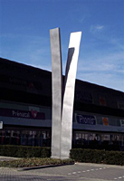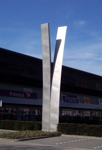 Reitscheweg, voor de ingang van Handelscentrum Soetelieveafmetingen: (element) 900 cm; dikte verlopend van 8 mm (buitenzijde) naar 18 mm binnenzijde; (samen) ca 170 cm; (blokvormen samen) 175 x 18 cmmateriaal: aluminium datering: 1983 vervaardigd door: Nico de Wit Een abstract aluminium kunstwerk, heel eenvoudig van opzet, bestaande uit twee identieke elementen van 900 cm hoog met een kleine ruimte ertussen van 9 mm, die omhoog komen uit twee blokvormen op de grond. De elementen buigen in tegengestelde richting en aan de bovenkant wordt de onderlinge afstand ca 200 cm. De twee losse spie-achtige elementen, lijken een element te vormen dat doorgesneden is. Het is gedacht vanuit het wegverkeer: de platen staan dwars op de weg en lijken een halt toe te roepen aan het verkeer, een frontale confrontatie. De ruwe schets is van 1981, maar toen de kunstenaar in 1983 de opdracht kreeg leek het voor dat specifieke punt gemaakt te zijn.164 | 95 |