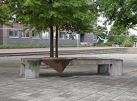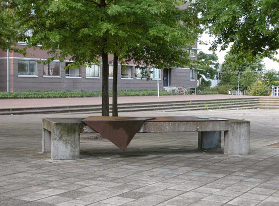 Tolbrugstraat, tegenover het politiebureau, op het trottoirafmetingen: 500 x 200 cmmateriaal: plaatstaal datering: 1981 vervaardigd door: Hans van Engeland Het kunstwerk bestaat uit een grote stalen plaat van 500 x 200 cm. Welke enkele keren is gevouwen. Het werk is in 1981 via de B.K.R. aangekocht. In 1983 besloot de gemeente tot plaatsing over te gaan en hiertoe werd het kunstwerk bevestigd op een glad afgewerkte betontafel van 400 cm lang, 150 cm breed en 70 cm hoog. | 93 |