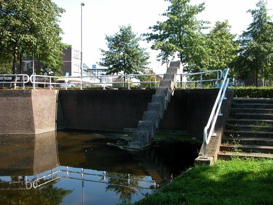 Maaspoortweg, bij de waterpartij tegenover het winkelcentrumafmetingen: 60 x 60 x 60 cmmateriaal: beton datering: 1983 vervaardigd door: Therèse Legierse Omgevingskunst in de vorm van twaalf aan elkaar bevestigde en elkaar (28 cm) overlappende betonnen kubussen, leidend vanuit de diepte van de waterkant langs de kademuur omhoog. Het geheel lijkt op een trap, doch het is geen begaanbare trap; de treden zijn iets gekanteld, waardoor de randen van de traptreden omhoog steken. Op het trottoir bevinden zich nog drie ronde betonnen elementen. De opdracht voor dit kunstwerk is door de gemeente 's-Hertogenbosch gegeven via de B.K.R., in het kader van de stadsverfraaiing. | 96 |