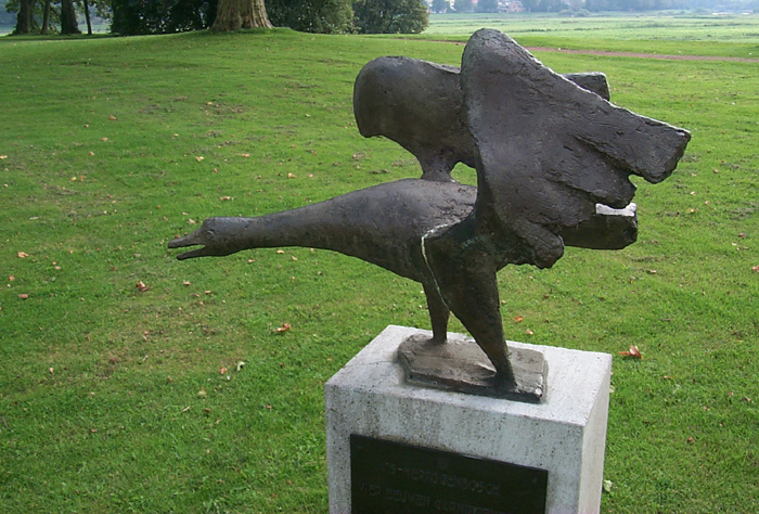 Bastion Oranjeafmetingen: 84 x 42 x 60 cmmateriaal: brons op een tufstenen sokkel datering: 1970 vervaardigd door: Louis Visser Een naturalistische gans staande in een verdedigende houding met gespreide vleugels en geopende snavel. Deze gans, als symbool van de waakzaamheid, is een gedenkteken voor het feit dat 's-Hertogenbosch in 1967 vier eeuwen garnizoensstad was en is aangeboden door het garnizoen. | 80 |