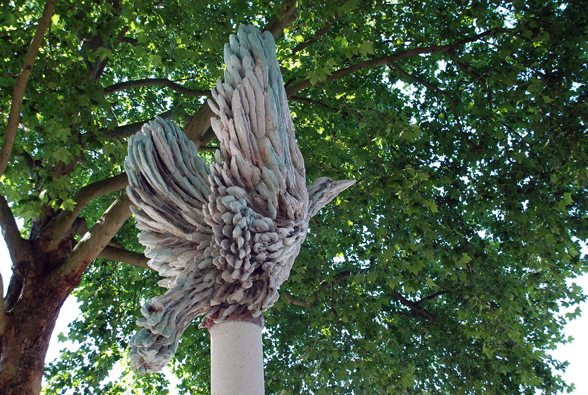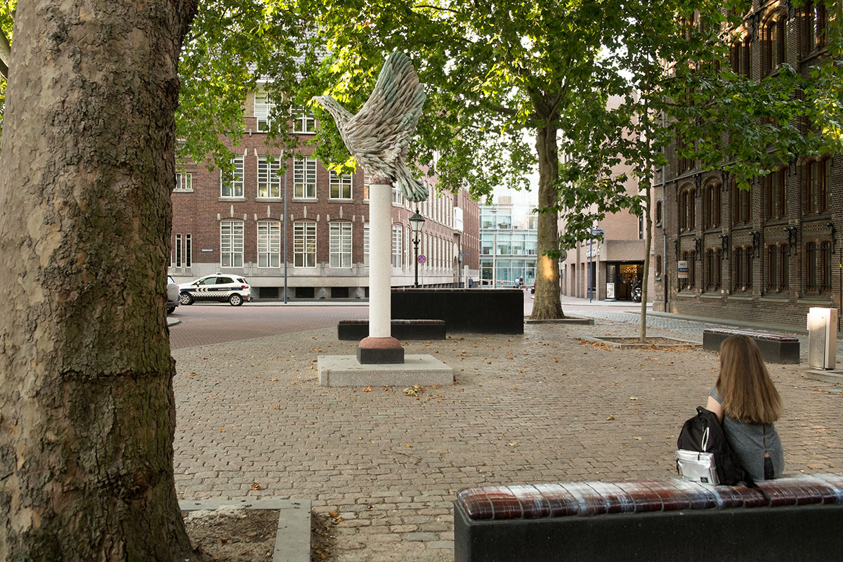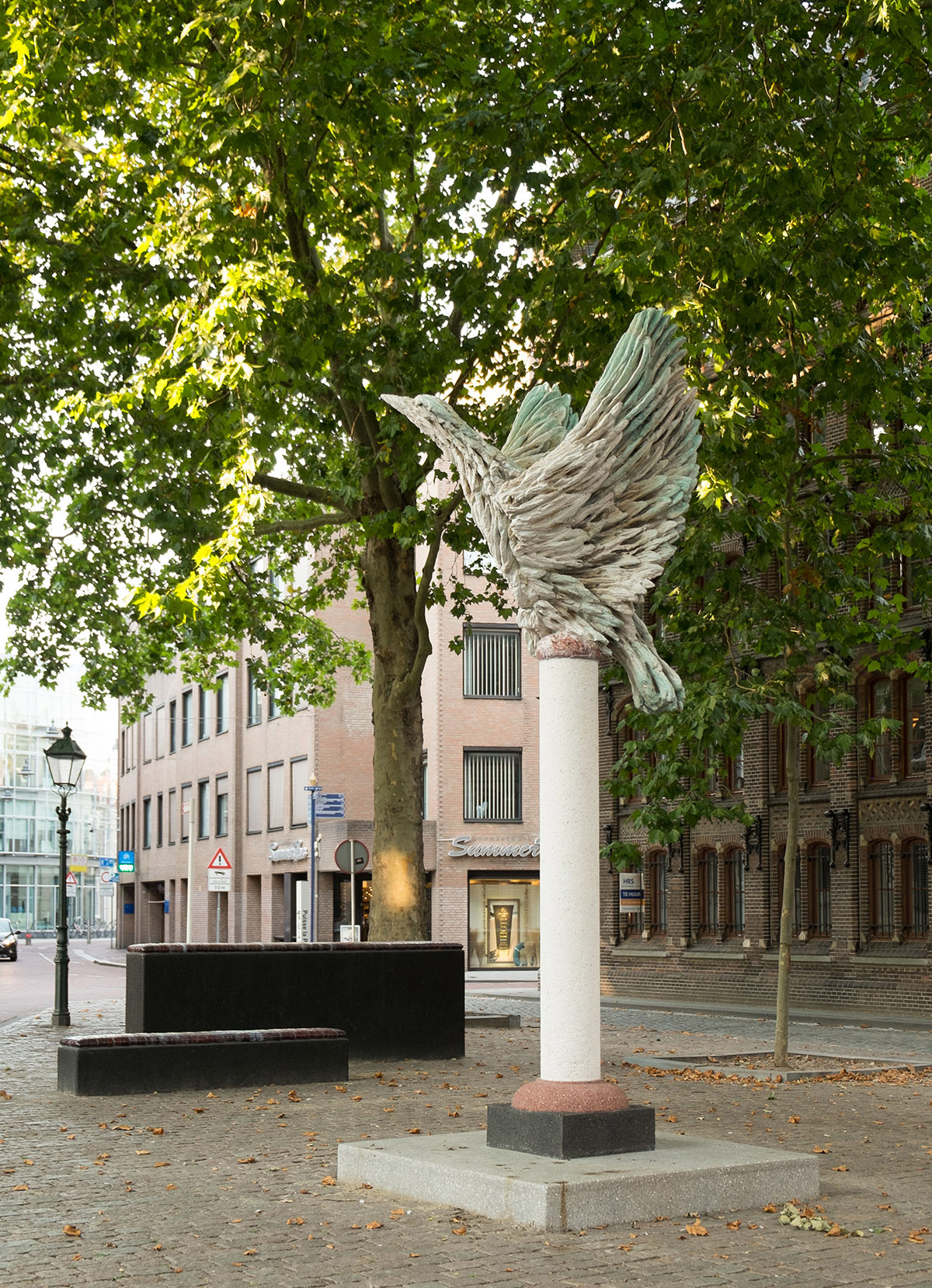 Op vrijdag 10 juli wordt het nieuwe beeld van Anne Wenzel op het Anne Frank Plein in ’s Hertogenbosch onthuld. In het ontwerp van Anne Wenzel staan twee begrippen voorop: herdenken en ontmoeten. Naar aanleiding van het leven van Anne Frank zal het plein ruimte bieden voor reflectie. Wat betekent vrijheid? Niet alleen voor Anne Frank, maar ook juist voor ons, hier en nu in Nederland. Centraal staat het dagboek van Anne Frank, dat op meerdere manieren op het plein terugkomt. Naar aanleiding van het citaat uit het dagboek van Anne Frank komt midden op het plein een opvliegende vogel van keramiek, geplaatst op een zuil. Een lichtgekleurde vogel als metafoor voor vrijheid en vrede. Het is een krachtige vogel. Maar het plein moet niet alleen een plein van herdenking worden, maar ook een plek van ontmoeting. Waar je bij elkaar kunt zitten, praten - maar ook rusten. Daarom komen op het plein drie speciaal ontworpen banken van donker terrazzo. Boven op de banken liggen keramische tegels die zowel qua patroon als ook kleur aan het ruitjespatroon van het dagboek van Anne Frank refereren. Door de uitstraling van de duurzame materialen zoals terrazzo en keramiek sluiten de banken en het beeld naadloos aan bij het historisch karakter van het plein. Een bijzondere plek op het plein zal de herdenkingsmuur innemen. Voor deze muur komen de reeds bestaande Pax Christi vredespaal te staan zoals ook de plaquette met het citaat uit het dagboek van Anne Frank: ‘Als ik opkijk naar de hemel, voel ik op de een of andere manier, dat deze wreedheid zal ophouden en dat de vrede zal terugkeren.’ Als de kijker voor de muur staat, dit citaat leest en vervolgens omhoogkijkt, ziet hij de opvliegende vogel op de gedenkzuil. Plaquette, vredespaal en vogel vormen tezamen e´e´n ode aan herdenken.