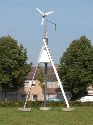 Helftheuvelweg, in het plantsoen bij de Schutskampafmetingen: 300 x 300 x 400 cmmateriaal: in kleuren gespoten aluminium datering: 1983 ontworpen door: Ad Louwinger uitvoering door: werkplaats Vosseveld, Vught Een grote aluminium driepoot (lengte poten 600 cm; onderlinge afstand 375 cm) gespoten in de kleuren zilvergrijs, geel, groen, rood, oranje en blauw in een fundering van beton, aangekocht door de gemeente 's-Hertogenboscvh in het kader van de stadsverfraaiing. | 96 |