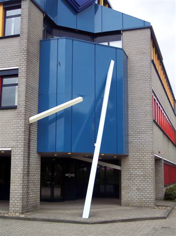 Rijkspolitiebureau, hoek De Beverspijken / De Haverijafmetingen: 700 x 21 x 17 cm; 200 x 21 x 17 cm; 300 x 21 x 17 cmmateriaal: in kleuren gespoten stalen balken datering: 1986 vervaardigd door: Claire Begheijn173 In de ingangspartij van het rijkspolitiebureau is een kunstwerk verwerkt, bestaande uit stalen balken: een balk van zeven meter is schuin tegen de muur bevestigd en zeegroen gespoten, een balk van twee meter komt links van de ingang uit de muur en is geel en de derde, drie meter lang en wit gespoten, steekt rechts van de ingang door de muur. Dit werk is in nauwe samenwerking met de architect tot stand gekomen in het kader van de percentage-regeling bij rijksgebouwen. | 106 |