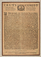 Extremely rare (unrecorded?) devotional broadsheet, printed by or for an otherwise unrecorded bookseller at ’s-Hertogenbosch. "De Vergulde Speelwagen" is a still existing house in the Hinthamerstraat, mentioned from 1606 onwards. In 1756 its is recorded as the "catoen- en boekwinkel van de Wed. Grimme" (Mosmans, Oude namen van huizen en straten in ’s-Hertogenbosch, 1907). Gremmen and Grimme was a typical Catholic family name in town and region.