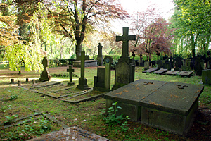 InleidingEnigszins afgescheiden van de rest vinden we in de noordoosthoek van het terrein de begraafplaats van Coudewater, toegankelijk via een smeedijzeren vleugelhek tussen bakstenen pilaren. Pontificaal op de as van het middenpad twee achter elkaar gesitueerde GRAFMONUMENTEN van de stichters, waarin hun vrouwen later zijn bijgezet. Aan weerszijden voornamelijk zustersgraven. Het graf van Van den Bogaert vertoont invloeden van het Eclecticisme en stamt uit 1880; het graf van Pompe, een Neo-renaissancistisch ontwerp, dateert uit 1901. De witmarmeren plaquettes ter nagedachtenis aan hun echtgenotes zijn toegevoegd in respectievelijk 1899 en 1908. Dr. E. van den Bogaert en Dr. L. Pompe, voorheen verbonden aan het Geneeskundig Gesticht Reinier van Arkel in Den Bosch, waren de initiatiefnemers voor Coudewater en hebben de psychiatrische inrichting in 1870 gesticht.OmschrijvingHet graf van Van den Bogaert bestaat uit een lage, licht oplopende hardstenen graftombe op rechthoekig grondplan. Symmetrisch. Overstekende dekplaat, omrand met lijst sierlijk gebeitelde florale motieven. Epitaaf: 'HULDE AAN DR. E.A.P. VAN DEN BOGAERT / STICHTER / EN / EERSTE GENEESHEER DIRECTEUR / DER / GENEESKUNDIGE INRICHTING / COUDEWATER [...]'.Op het graf van Pompe staat een smal hardstenen grafmonument op een rechthoekige plattegrond. Het is symmetrisch en frontaal gericht en rijst hoog op waarbij het door versnijdingen en verjongingen steeds smaller wordt. Bekroning met ezelsrug. Plaquette met epitaaf aan de voorzijde: 'DR. L. TH. POMPE / MEDE OPRICHTER / VAN HET GESTICHT / COUDEWATER [...]', bekroond met een guirlande en een kruisvorm waartussen florale decoraties. WaarderingHet tweetal grafmonumenten is van algemeen belang. Het bezit cultuurhistorische waarden als bijzondere uitdrukking van de herinneringscultus ter nagedachtenis aan de stichters van Coudewater; als bijzondere uitdrukking van de grafcultuur binnen de geestelijke gezondheidszorg; als uitdrukking van de rooms-katholieke emancipatie. Het bezit tezamen met de rest van de begraafplaats en de overige tot Coudewater behorende objecten ensemblewaarden als essentieel onderdeel van een historisch gegroeid ensemble in de geestelijke gezondheidszorg.Daarnaast vanwege de situering op een plek in de noordoostelijke hoek van het terrein, verbonden met de verdere uitleg van het complex en verder als markant onderdeel van de historische bebouwing aan de P. de Gorterstraat. Het is van belang wegens de gaafheid. |