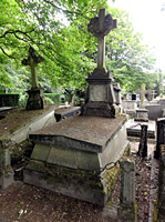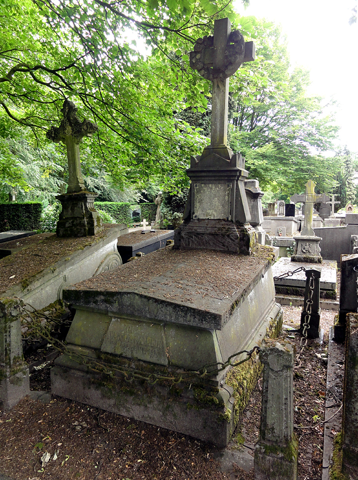 InleidingGrafmonument van de familie Th. Halewijn ( 1894). In 1894 in Eclectische vormen vervaardigd door de Bossche architect/beeldhouwers Dobbe en Van Pelt. Het graf bevindt zich ten westen van de bisschopskapel in sectie 21-13-01-10.OmschrijvingHet grafmonument bestaat uit een door een hardstenen voetplaat met hoekpaaltjes omgeven tombe met aan het hoofdeinde van de grafplaat een stèle met kruisbekroning. De rechthoekige paaltjes zijn geometrisch geornamenteerd en lopen iets taps toe. Ze zijn onderling verbonden door gedraaide smeedijzeren schakelkettingen. De tombe heeft een trapezoïde-vormige opbouw met insnoeringen en een aflopende, tweezijdig afgeschuinde grafplaat met inscripties. Ook in de stèle komt de trapezoïdevormige opbouw terug. Deze wordt verder bekroond met frontons die het basement van het kruis omgeven. Aan de voorzijde van de opbouw is een marmeren plaquette aangebracht. De stèle wordt bekroond door een kalkstenen kruis waaraan een stenen bloemenkrans is opgehangen. De signatuur bevindt zich rechtsvoor op de voetplaat.WaarderingHet grafmonument is van algemeen belang. Het heeft cultuurhistorische waarde als bijzondere uitdrukking van een sociale en geestelijke ontwikkeling, in het bijzonder de ontwikkeling van de katholieke grafcultuur, het is tevens van belang als illustratie van de typologische ontwikkeling van het grafmonument. Het graf heeft ensemblewaarden als onderdeel van een groter geheel met cultuurhistorische, architectuurhistorische en typologische samenhang. Het is gaaf bewaard gebleven en typologisch zeldzaam. |