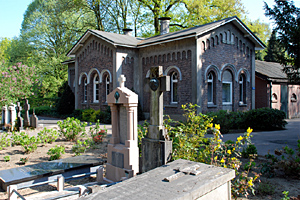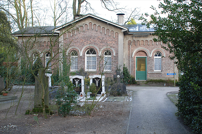 Voormalig lijkenhuis, tegenwoordig dienstgebouw, in 1872 in Neo-Romaanse vormen gebouwd. Het pand bevindt zich iets ten oosten van de kapel (onderdeel II), midden op het terrein van de begraafplaats. De zinken dakbedekking is omstreeks 1988 vervangen door de huidige van dakleer.OmschrijvingHet éénlaags gebouw heeft een rechthoekige grondslag met een uitstekende middenrisaliet met gevels in schoon metselwerk onder met dakleer gedekte zadeldaken met klein overstek en houten klossen. Opvallende decoratie door middel van een circa 60 cm hoge gecementeerde plint, gecementeerde hoekpilasters, rondboogfries onder de dakrand en vensterwenkbrauwen. Gekoppelde rondboogvensters met hardstenen onderdorpels en zesruits ramen met Y-vormig gedeeld klapbaar bovenlicht. Oorspronkelijk bevond de ingang van het gebouw zich centraal in de middenrisaliet. Deze is verplaatst naar de rechterzijde van de voorgevel. Hiervoor werden twee bestaande vensters respectievelijk verkleind en vergroot. Aan de achtergevel is de detaillering soberder. Het rondboogfries is vervangen door een doorlopende cementering. De centrale deur voor het toilet wordt hier geflankeerd door twee rondboogvensters als in de voorgevel. Deze worden op hun beurt weer geflankeerd door gekoppelde kleine rondboogvenstertjes.Intern is de sobere indeling grotendeels gehandhaafd. WaarderingHet voormalige lijkenhuis is van algemeen belang. Het heeft cultuurhistorische waarde als bijzondere uitdrukking van een sociale en geestelijke ontwikkeling, in het bijzonder de ontwikkeling van de katholieke grafcultuur, het is tevens van belang als illustratie van de typologische ontwikkeling van met begraafplaatsen verbonden architectuur. Het heeft architectuurhistorische waarde vanwege de toegepaste neoromaanse stijlelementen. Het heeft ensemblewaarden als onderdeel van een groter geheel met cultuurhistorische, architectuurhistorische en typologische samenhang. Het is gaaf bewaard gebleven en typologisch zeldzaam. |