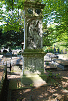 Grafmonument familie Lutkie-Scheffers. Natuursteen en brons 123 x 52 cm. Datering 1885. Het sterk verweerde grafmonument heeft een nis met twee bronzen medaillons met naturalistische portretten van de overledenen en een reliëf van een zittende engel in hoog reliëf met palmtak en krans. De vorm van het grafmonument en de wijze waarop de engel is weergegeven doen denken aan een Griekse stèle. De overlijdensdata zijn 1881 en 1885. Het reliëf en de portretten zullen nauwelijks later dan 1885 gemaakt zijn. Op de linkerzijkant van het monument bevindt zich een moeilijk leesbare signatuur, mogelijk 'Stracké-Klep'. | 22 |