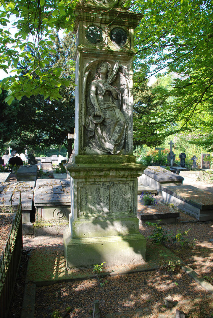 InleidingGrafmonument voor Christoffel Christianus Lutkie (1814-1881) en diens echtgenote Petronella Sch..ers (181.-188.). Het grafmonument is omstreeks 1881 in Eclectische vormen opgericht en valt op door de hoge kwaliteit van de ornamentiek. Het wordt omgeven door een laag ijzeren hekwerk met Neo-Gotische ornamentiek. Het graf is gelegen aan de westelijke zijde van de bisschopskapel in sectie 25-12-09-04.Ligging voor nadere plaatsbepaling en juiste naamduiding: pal ten zuiden van het graf van Arnoldus J.B. Mertens (1899 - 1959). OmschrijvingHet grafmonument bestaat uit een hoog opgaande stèle met kalkstenen reliëf en twee bronzen portretmedaillons. De opbouw hiervan is verdeeld in vijf, zich verjongende zones. Deze zijn slechts aan de voorzijde geornamenteerd. Bovenop een rechthoekig hardstenen basement bevindt zich een voet met op de voorzijde een in tweeën gedeeld vlak met de epitafen. Hierboven bevindt zich een hoog kalkstenen tussenstuk met een nis een voorstelling van een zittende engel. De engel is gekleed in een lang, geplooid gewaad en heeft de blik omhoog gericht. In de rechterhand houdt de engel een lauwerkrans, in de tot borsthoogte geheven linkerhand een palmtak. De vleugels worden benut als omlijsting van de nis. In de zone boven het reliëf bevinden zich twee ronde bronzen portretmedaillons van de overledenen. Deze tonen de gelaten van de overledenen in 3/4 profiel. De stèle wordt bekroond door een omgekeerd hart dat aan de zijden ondersteund wordt door voluten. In het hart is centraal een kruis in reliëf aangebracht.Het monument was oorspronkelijk voorzien van een verflaag (vermoedelijk wit). Waar deze nog aanwezig is, is hij zwaar aangetast en verweerd. Aan de voet van de engel bevindt zich een niet meer leesbare inscriptie. Het grafmonument wordt omgeven door een laag ijzeren hekwerk met neogotische ornamentiek van in elkaar overlopende bogen en spitsbogen. WaarderingHet grafmonument is van algemeen belang. Het heeft cultuurhistorische waarde als bijzondere uitdrukking van een sociale en geestelijke ontwikkeling, in het bijzonder de ontwikkeling van de katholieke grafcultuur, het is tevens van belang als illustratie van de typologische ontwikkeling van het grafmonument. Het graf heeft kunsthistorisch belang vanwege de hoge kwaliteit van de toegepaste eclectische en neogotische ornamentiek. Het graf heeft ensemblewaarden als onderdeel van een groter geheel met cultuurhistorische, architectuurhistorische en typologische samenhang. Het is gaaf bewaard gebleven en typologisch zeldzaam. |