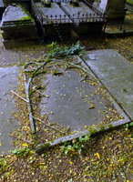 InleidingGRAF van een overledene (1797-..), diens echtgenote en een derde overledene. De twee grafplaten met onleesbare teksten zijn omstreeks 1870 vervaardigd in Neo-Gotische vormen. De geornamenteerde grafplaat is gelegd naast de afdekplaat voor de onderliggende grafkelder. Het graf bevindt zich ten westen van de bisschopskapel in sectie 25-12-10.Ligging voor nadere plaatsbepaling en juiste naamduiding: pal ten zuiden van het graf van Harrij Constanje (31 december 1947 - 1 oktober 1964). OmschrijvingGraf met onderliggende grafkelder, bestaande uit twee naast elkaar gelegen, ongeveer even grote, rechthoekige grafplaten van hardsteen. De ongeornamenteerde linkerplaat heeft als inscriptie: ingang der grafkelder.De rechterplaat is in het bovenste deel geornamenteerd met een getote spitsboog en in elke zwik een driepas gevat in een cirkel. Bovenin de boog is in reliëf een op een voet geplaatst kruis met driepassen aan de uiteinden aangebracht. De grafplaat is voorzien van inscripties in gotische letters. WaarderingHet grafmonument is van algemeen belang. Het heeft cultuurhistorische waarde als bijzondere uitdrukking van een sociale en geestelijke ontwikkeling, in het bijzonder de ontwikkeling van de katholieke grafcultuur, het is tevens van belang als illustratie van de typologische ontwikkeling van het grafmonument. Het graf heeft kunsthistorisch belang vanwege de toegepaste neogotische ornamentiek. Het graf heeft ensemblewaarden als onderdeel van een groter geheel met cultuurhistorische, architectuurhistorische en typologische samenhang. Het is gaaf bewaard gebleven en typologisch zeldzaam. |
