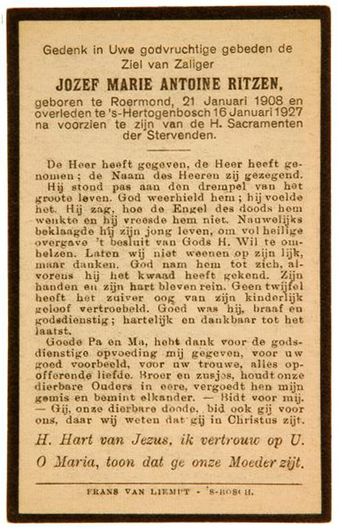 Doodsprent van Jozef Marie Antoine Ritzen (1908-1927)