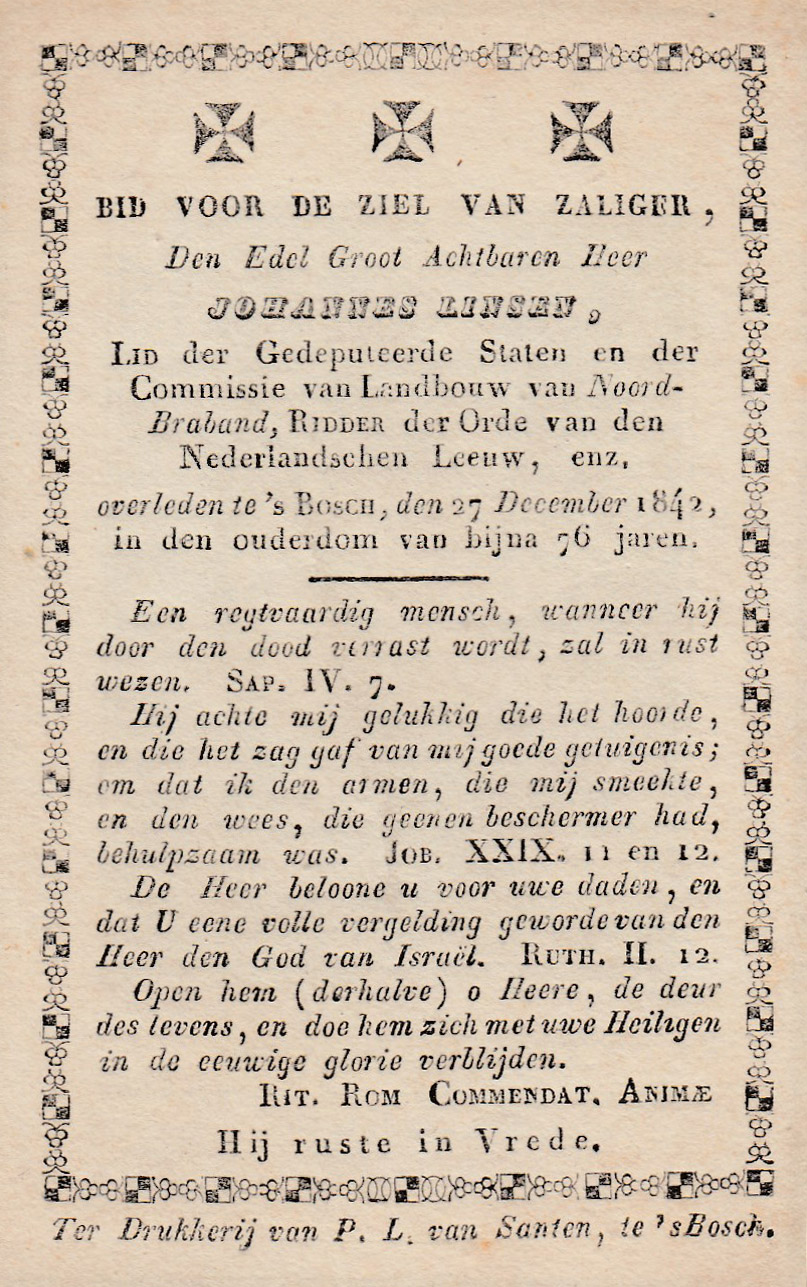 LINSEN (Jan), geb. te Grave (gedoopt 20 Jan. 1767), overl. te 's Hertogenbosch 27 Dec. 1842, was de zoon van Jan Linsen. Hij behoorde, zooals zeer velen in het generaliteitsland, tot de Patriotten. Hij werd in Oct. 1795 secretaris van het comité van Financiën van de provincie Bataafsch Brabant, en werd in Apr. 1797 gekozen tot lid van de staten dier provincie. Op 15 Febr. 1798 werd hij als te gematigd door den agent van het Uitvoerend bewind afgezet, maar 26 Juni d.a.v. door het na den tweeden staatsgreep opgetreden bewind tot lid van het administratief bestuur der provincie benoemd. Bij de verkiezingen voor het bestuur van het departement Dommel werd hij in den ring Os 20 Dec. 1798 gekozen; dit bestuur bestond slechts uit 7 leden en er was geen ander bestuur, zoodat dit een belangrijk ambt was. Het bestuur fungeerde tot 21 Juni 1802; toen was op 4 Juni een nieuw departementaal bestuur, nu weder voor Brabant met zijn oude grenzen, ingesteld, waarin Linsen niet werd opgenomen, doch hij werd 21 Sept. d.a.v. tot lid der rekenkamer van dat departement benoemd. Op 19 Juli 1805 benoemde Schimmelpenninck hem met ingang van 1 Aug. tot lid van den raad van Financiën van hetzelfde departement. Eindelijk werd hij door koning Lodewijk 8 Mei 1807 benoemd tot assessor in Brabant (tot nu toe had het Bataafsch Brabant geheeten). Deze betrekking stond gelijk met lid van Gedeputeerde staten thans.