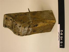 Geprofileerd: kwart hol, kwart bol. Met smeedijzeren spijkers afkomstig uit het pand Gasthuisstraat 8-10. Een console diende als vergroting van het draagvlak van een balkeinde van een vloerconstructie. De sleutelstukken waren modegevoelig en meestal rijk versierd met houtsnijwerk en profileringen.