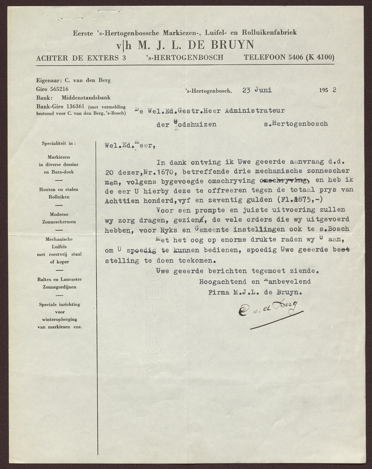 Eerste 's-Hertogenbossche Markiezen-, Luifel- en rolluikenfabriek v/h M.J.L. de Bruyn