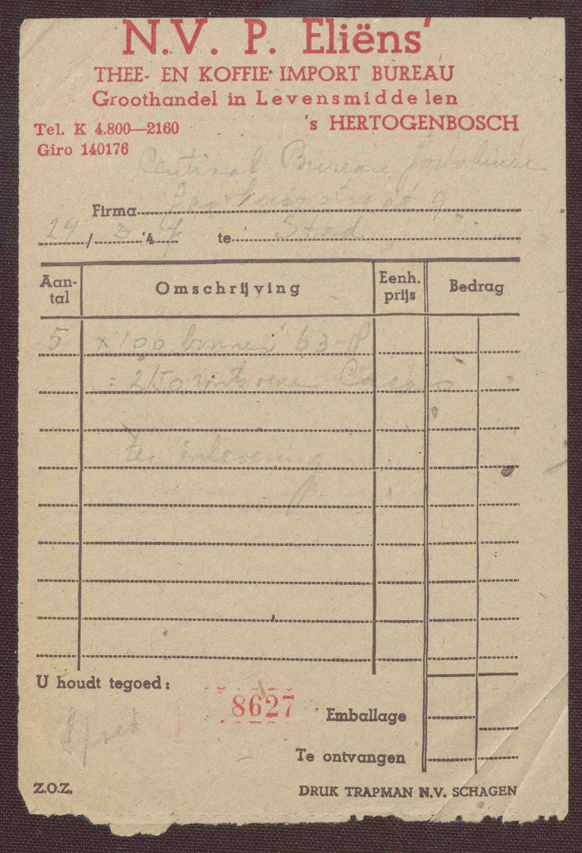 N.V. P. Eliëns : Thee- en koffie Import Bureau - Groothandel in Levensmiddelen