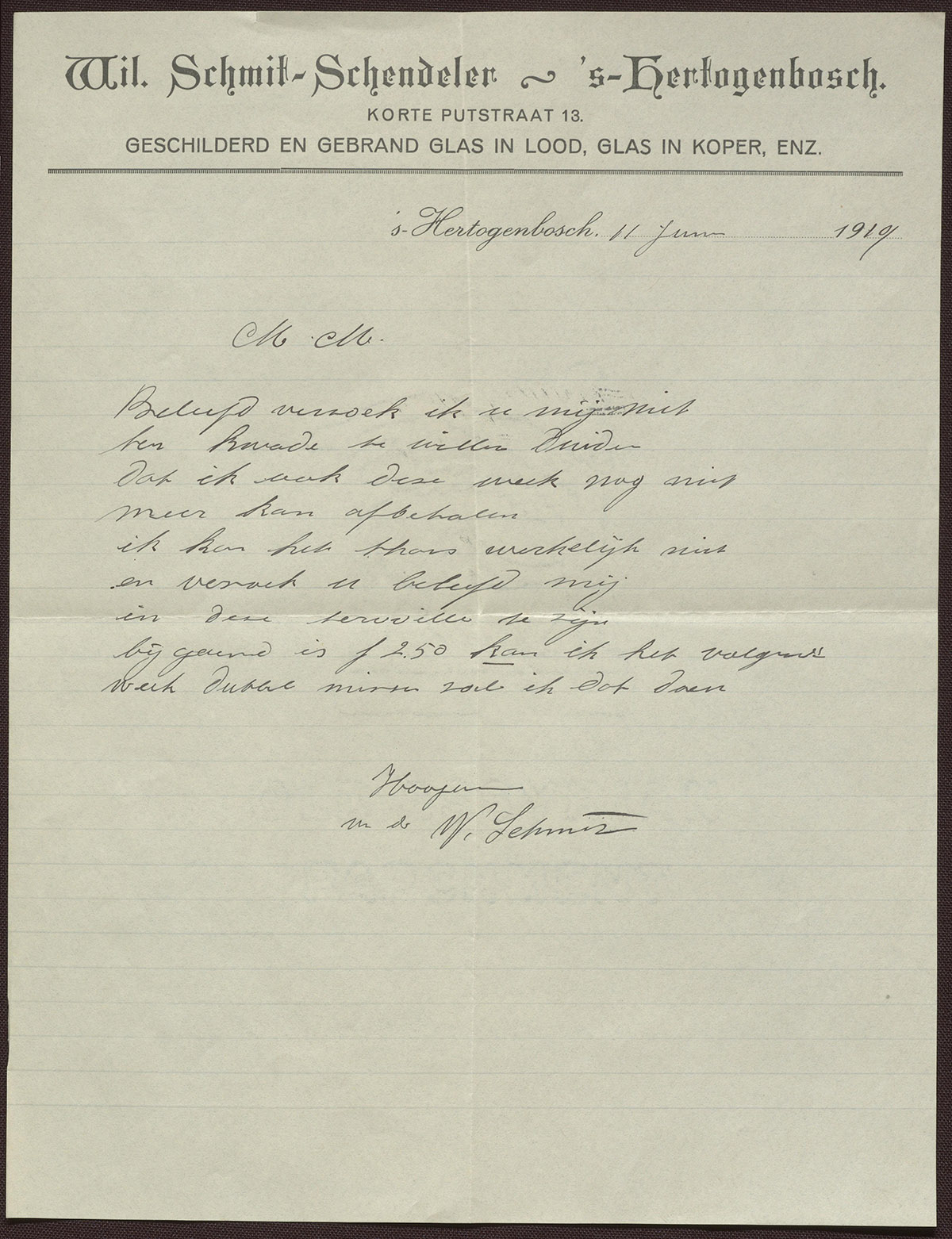 Wil. Schmit-Schendeler : Geschilderd en gebrand glas in lood, glas in koper, enz.