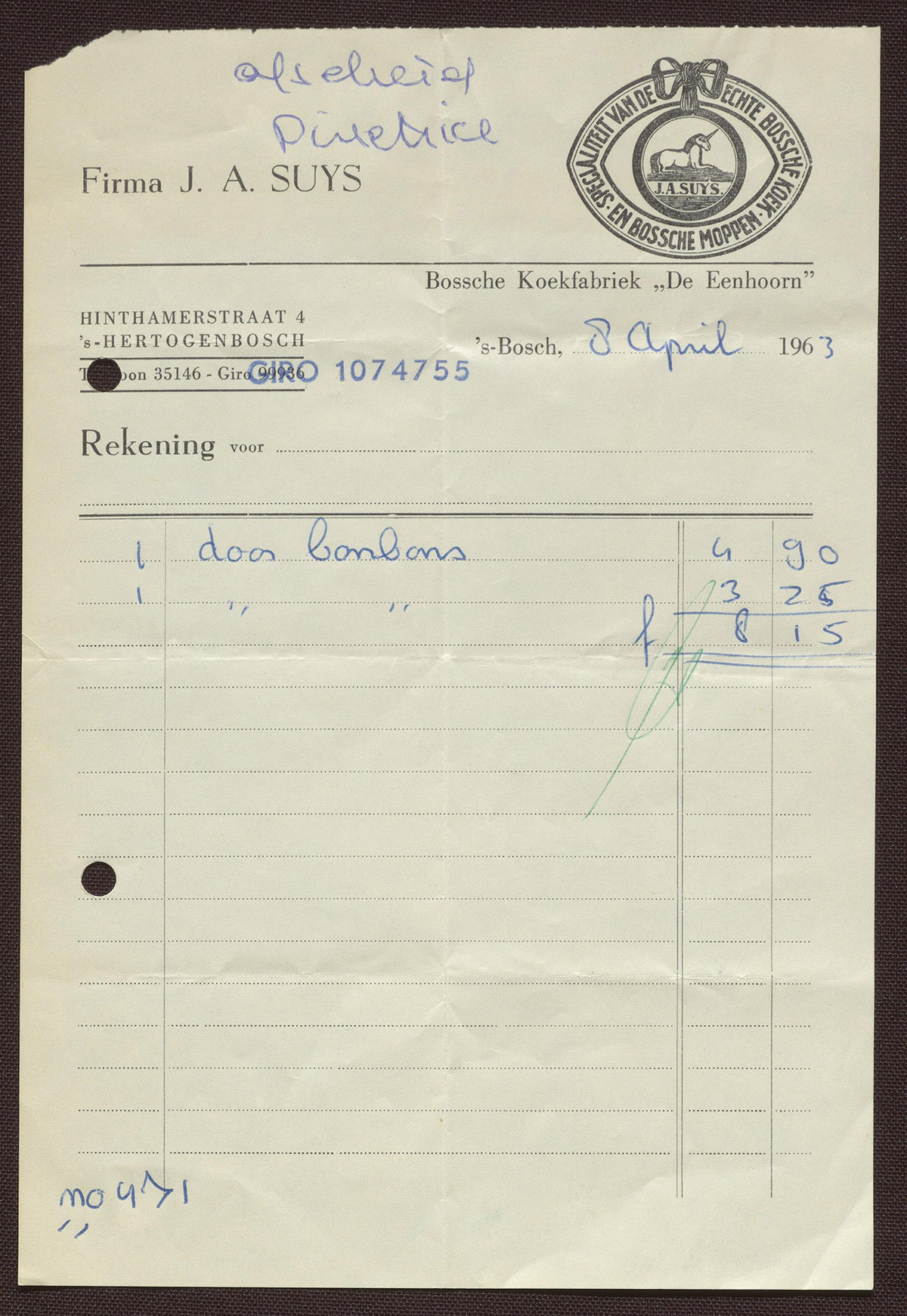 Firma J.A. Suys : Bossche Koekfabriek 'De Eenhoorn'