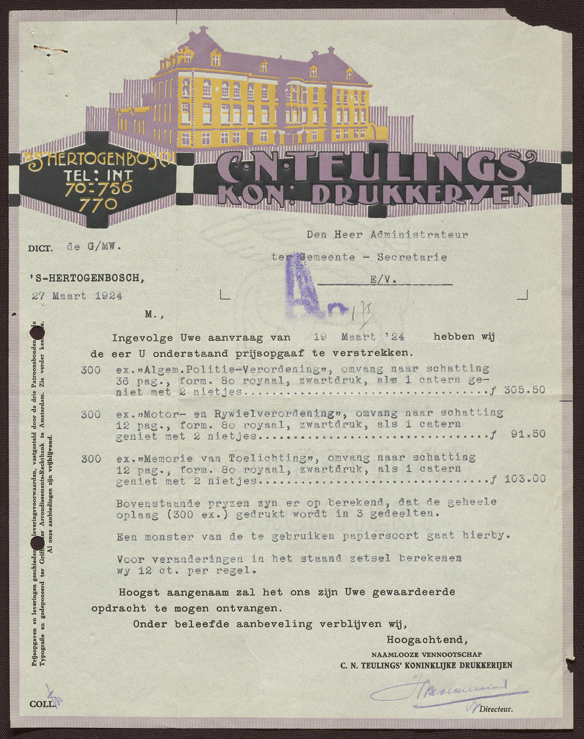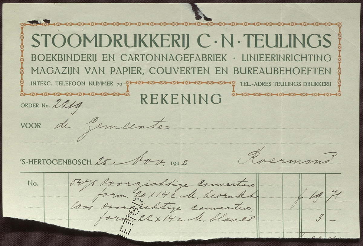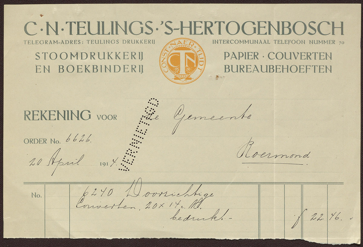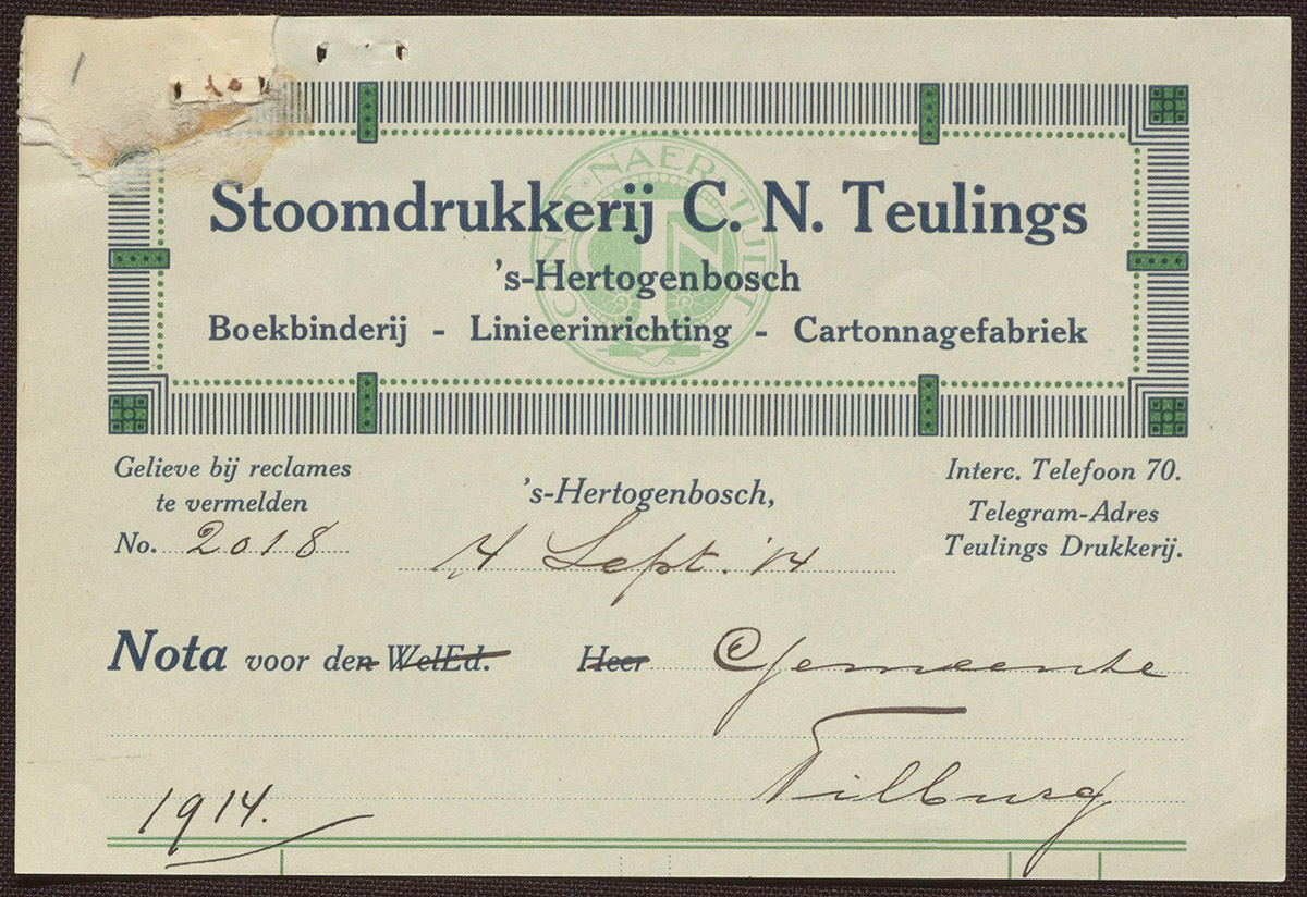 C.N. Teulings 's-Hertogenbosch : Stoomdrukkerij en Boekbinderij : Papier Couverten : Bureaubehoefen