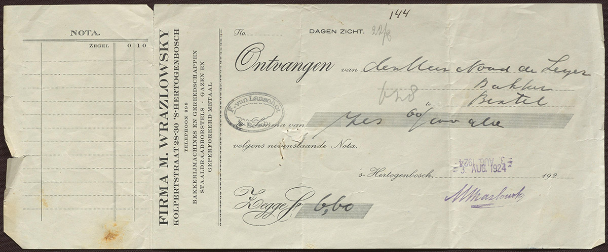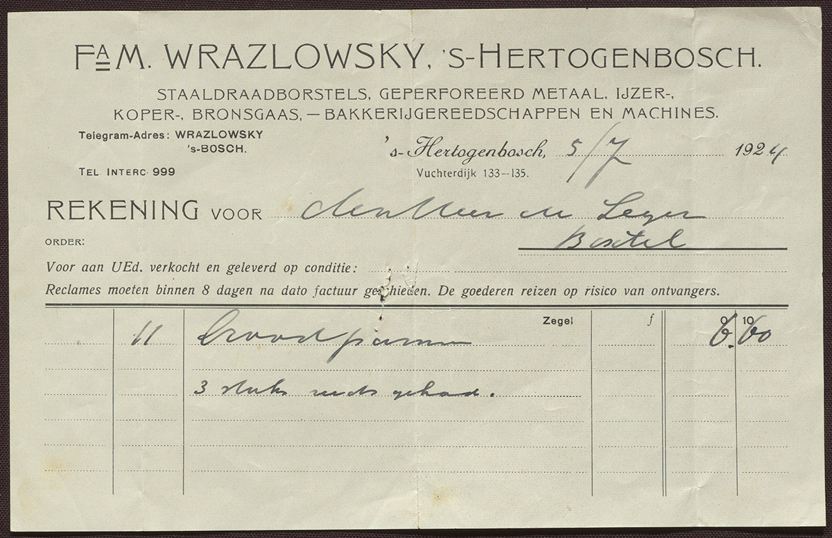 Firma M. Wrazlowsky 's-Hertogenbosch : Bakkerijmachines en gereedschappen - staaldraadborstels - gazen en geperforeerd metaal