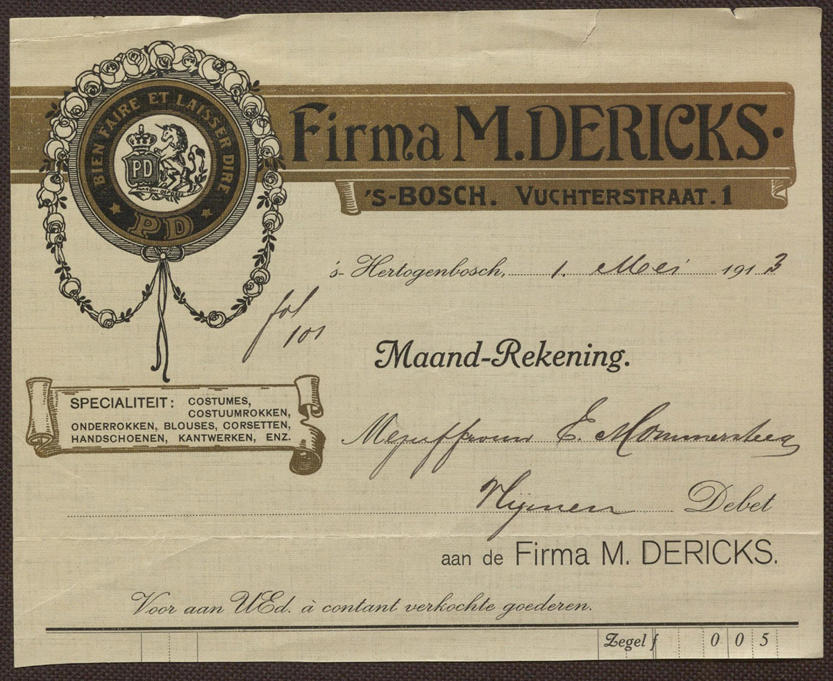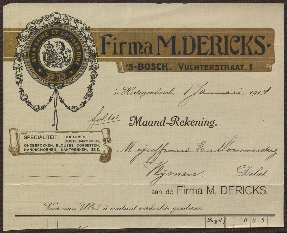 Firma M. Dericks : Costumes, costuumrokken, onderrokken, blouses, corsetten, handschoenen, kantwerken, enz.