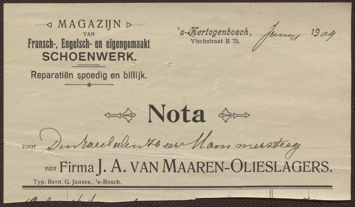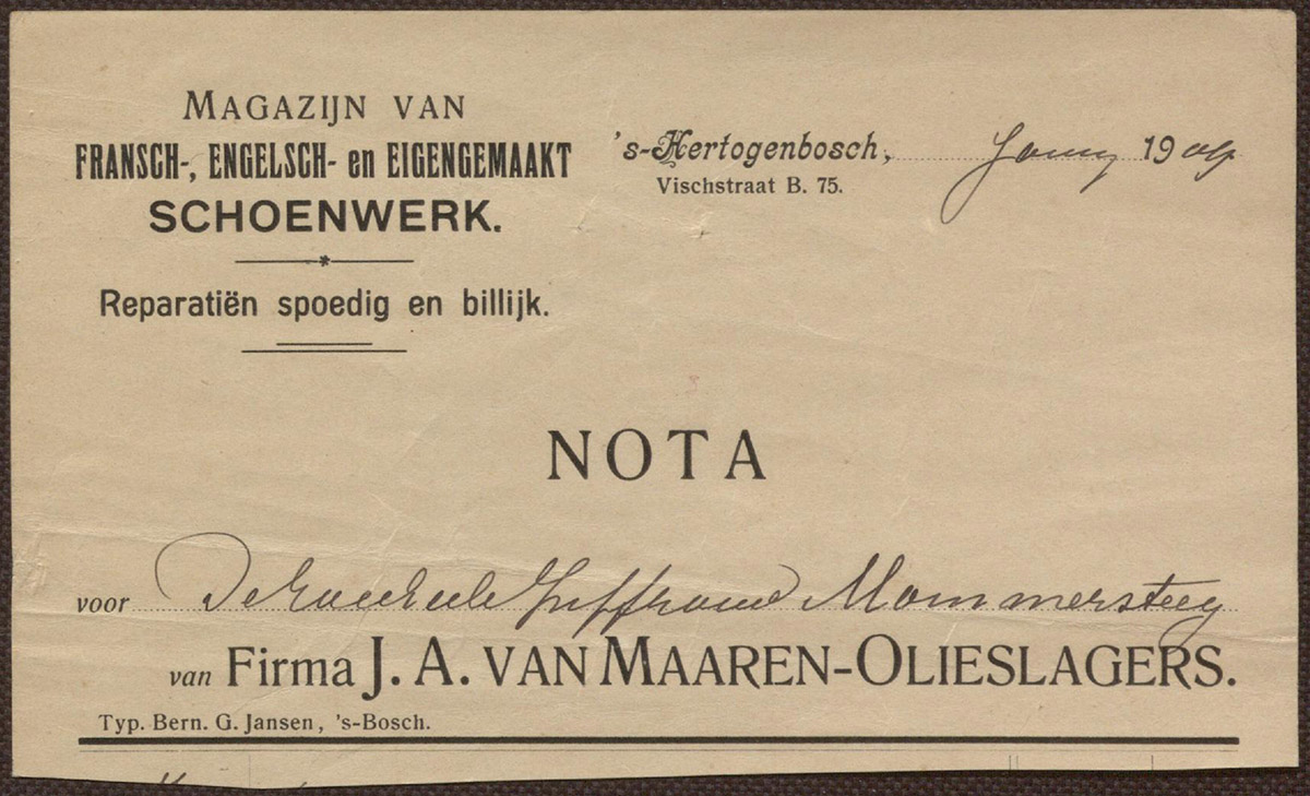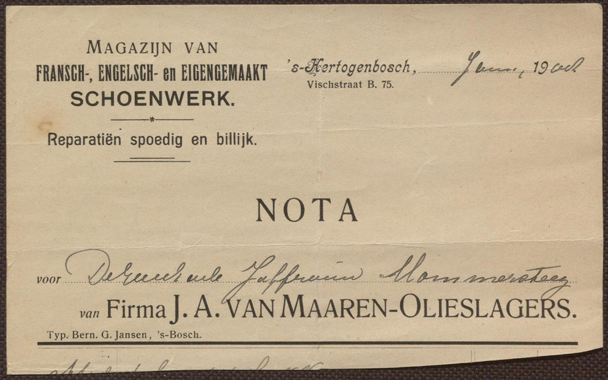 Firma J.A. van Maaren-Olieslagers : Magazijn van Fransch-, Engelsch- en eigengemaakt schoenwerk
