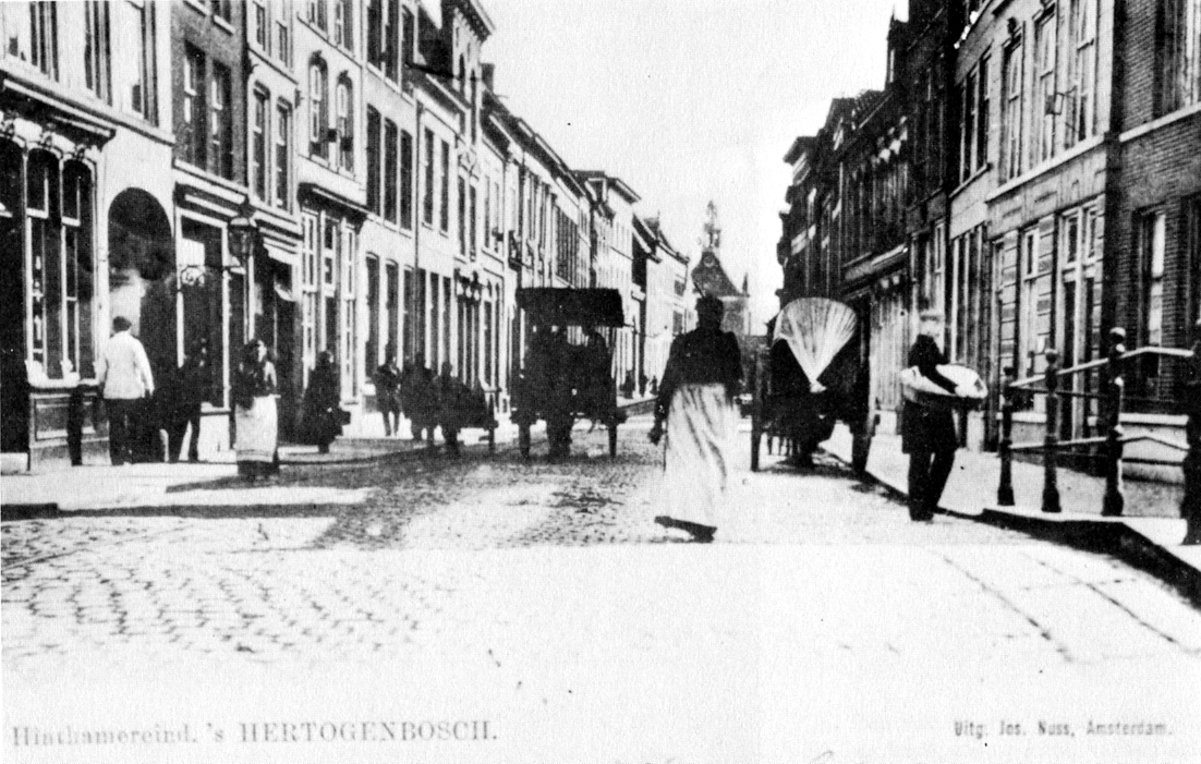 Vroeger hield de Hinthamerstraat op bij de Geerlingsebrug. Daarachter begon reeds het Hinthamereinde. Pas veel later werd de straatnaam Hinthamerstraat gebruikt voor de straat vanaf de Markt tot aan de Zuid-Willemsvaart, en resteerde van het oorspronkelijke Hinthamereinde nog slechts een klein deel. De Geerlingsebrug dankt haar naam aan Ridder Geerling van den Bossche, die hier rond 1300 in de Hinthamerstraat naast de Binnendieze woonde. Na zijn dood werd het grote pand eigendom van zijn broer die het bij testament bestemde tot een klooster voor de Clarissen. Vanaf het midden van de veertiende eeuw verbleven deze religieuzen ruim driehonderd jaar in dit klooster, tot de Capitulatievoorwaarden van 1629 het onmogelijk maakten nieuwe zusters op te nemen. Het pand werd daarna particulier woonhuis. Het is het huidige nummer 141. Tussen dit pand en de Binnendieze strekte zich een grote tuin uit, die pas in het begin van de negentiende eeuw bebouwd werd. De naam Geerlingsebrug is reeds in 1448 vermeld. Op de brug stond een 'O.L. Vrouwehuisje', kennelijk een nis of kapelletje met een Mariabeeld, tegen een muur. Toen deze muur in 1633 bouwvallig geworden was, is deze door het stadsbestuur afgebroken. De brug zag er toen geheel anders uit als thans het geval is. De Geerlingsebrug was smaller en ongeveer even breed als de huidige rijweg. De voetgangers moesten kennelijk even over de straat lopen als de brug gepasseerd moest worden. Bij de brug lag ook een trap, die vanaf de straat naar het water ging. De Hinthamerstraat is altijd een van de drukste Bossche straten geweest. In het begin van deze eeuwheeft er zelfs een tram gelopen. /in de dertiger jaren viel het besluit om de Geerlingsebrug te verbreden: de leuningen zouden in het verlengde van de rooilijn komen en de trap verdween. Het verkeer zou later nieuwe eisen stellen aan de Hinthamerstraat en in 1964 viel het besluit om in grote delen van de stad éénrichtingsverkeer in te voeren. Maar met name in de Hinthamerstraat is deze richting nog wel eens veranderd: dan reden de auto's richting Markt, en later moest het net andersom! En weer andersom... Het vorig jaar is de Hinthamerstraat heringericht. Daar waar eens de trottoirs de bevallige lijnen van de gevelwand volgden, zijn thans de trottoirbanden kaarsrecht aangelegd. Een disharmonie in het lijnenspel van onze fraaie binnenstad. De marmere bestrating in de Hinthamerstraat is afwijkend ter hoogte van de Geerlingsebrug: het duidt op de eronder stromende Binnendieze. Het is alleen jammer dat andere historische elementen -zoals een versmalde brug die aangeeft dat men hier ècht het stadscentrum nadert- niet zijn toegepast. |