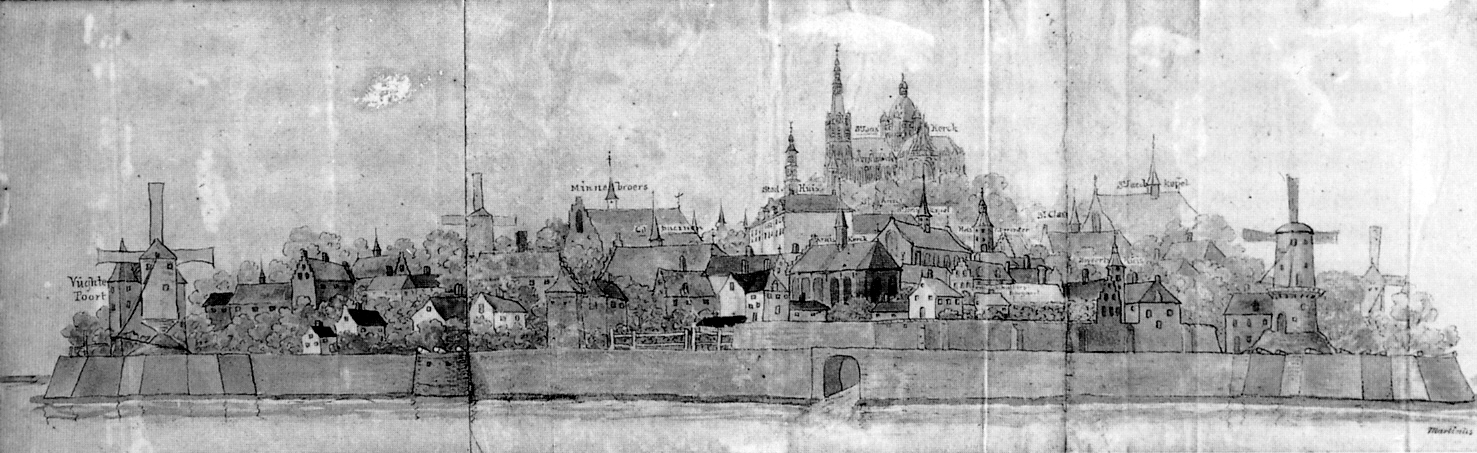 Alhoewel de belangrijkheid van de stad in de 17e eeuw sterk was afgenomen toonde de stad nog steeds in haar rijkdom aan oude voorname gebouwen de glorie van weleer. Op de tekening zijn de bekenste gebouwen in fantasieopstelling geplaatst. |