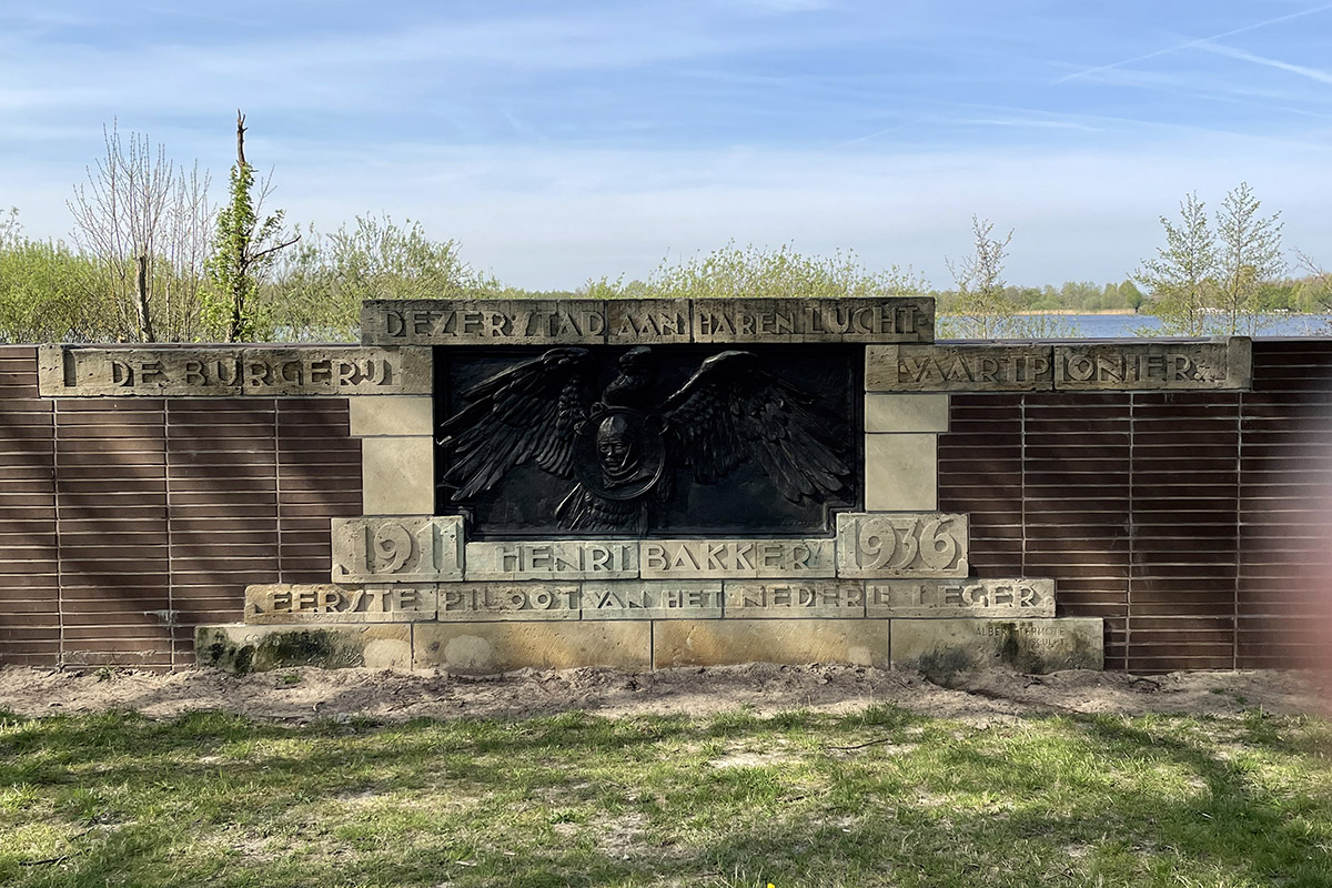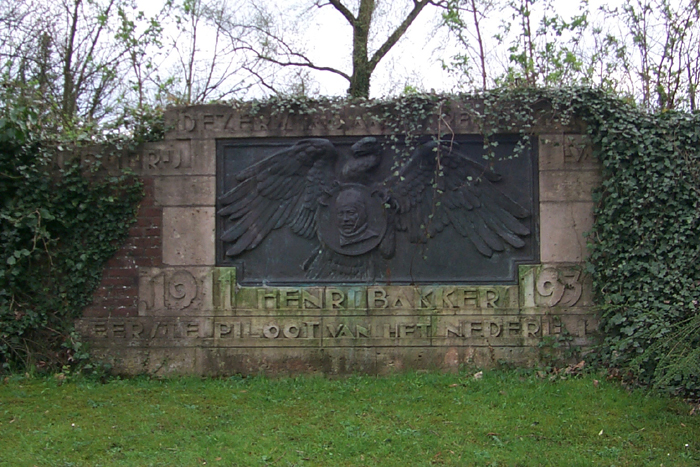 Hoek Hekellaan/Pettelaarseweg, tegen het ronddeel van de stadswallen.afmetingen: monument als geheel 550 x 180 cm; plaquette 120 x 92 cmmateriaal: brons en natuursteen datering: 1938 vervaardigd door: Albert Termote Monument met bronzen plaquette ter herinnering aan de op 13 maart 1933 overleden eerste Bossche vlieger met de beeltenis van Bakker en het opschrift: 'De burgerij dezer stad aan harer luchtvaartpionier Henri Bakker, eerste piloot van het Nederlandse leger'. Aan de voorzijde van het monument links beneden staat vermeld: 'Co Brandes arch'. De bronzen plaquette is rechtsonder gesigneerd: 'A. Termote 1938'. | 44 |