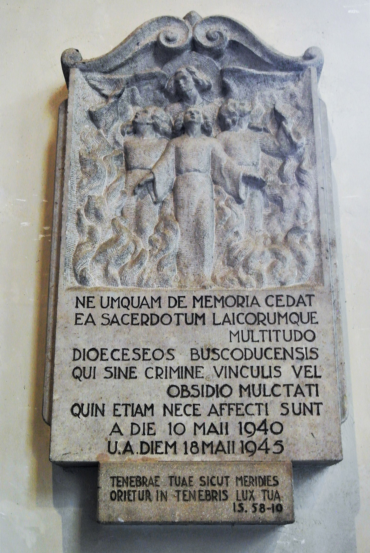 Uiteindelijk wordt de soep niet zo heet gegeten als opgediend. Er wordt wederzijds contact gezocht over de te volgen stappen.De uitvoering van het monumentEr wordt in eerste instantie gedacht aan een beeldengroep, met de steniging van de H. Stefanus. Hij is de eerste martelaar na de dood van Jezus Christus door toedoen van Saulus. (zie: Handelingen der Apostelen, hoofdstuk 6 en 7).Volgens aantekeningen in een brief van 16-3-1947 van Huijboom aan de plebaan zou aan het bedoelde monument de tekst toegevoegd moeten worden: “Heer, reken hun deze zonden niet toe”. Dit idee geeft volgens Huijboom “de gemoedsstemming aan van de priesters die hier herdacht worden en ook martelaren zijn geweest en waarvoor sommigen zelfs hun leven hebben gegeven”. In het voorjaar ’48 komt het idee van een vlakke gedenkplaat bovendrijven, in plaats van een beeldengroep. Dit leidt tot een conflict, met als gevolg dat de commissieleden Van Kessel en Van Dongen ontslag nemen en alleen Huijboom overblijft. Het wordt een kwestieOp 4 december 1949 schrijft plebaan Van Susante een resumé over de kwestie ‘Priestermonument’ aan bisschop Mutsaerts, op diens verzoek. Daaruit blijkt dat in overleg met het comité aan de heer Jac. de Bresser de opdracht is gegeven om ontwerpen te maken. Maar omdat deze ontwerpen niet voldoen, wordt er in overleg met de architect besloten een gedenksteen in plaats van een monument te plaatsen. Er is immers onvoldoende geld beschikbaar en evenmin is er een geschikte plaats.Verder schrijft de plebaan dat Huijboom zeer teleurgesteld is, de beste bedoelingen heeft gehad, de laatste tijd ernstig ziek is, zo zelfs dat hij voorzien moest worden van de laatste HH. Sacramenten. De plebaan besluit aldus: “Mocht het voorstel van het kerkbestuur om een gedenkplaat (gedenksteen) aan te brengen in plaats van een monument de goedkeuring wegdragen van U Hoogw. Exc. en dat plan misschien zelfs door u worden overgenomen als bemiddelingsvoorstel, dan is het wellicht mogelijk, dat de zaak tot een goede oplossing komt.” De bisschop vindt het inderdaad een goed compromis, zo schrijft hij op 6 februari 1950, aan de plebaan èn Huijboom. GedenktafelTwee en een half jaar later ontvangt de springlevende Huijboom - op 27 oktober 1952 - van plebaan Van Susante een brief dat het monument is gereedgekomen en dat het een waardige plaats zal krijgen in de H. Sacramentskapel. (Huijboom overlijdt op 16 december 1955).Aan de noordzijde van de kooromgang, niet in de Sacramentskapel, hangt tegen een pijler de gedenkplaat. Die is, zoals reeds aangegeven, niet vaak te zien vanwege de bouw van de grote kerststal, die elk jaar vanaf half september opnieuw wordt opgebouwd en pas eind februari is opgeruimd. Daarna kan dit deel van de kooromgang weer bezocht worden. Er staan geen namen op de gedenksteen, hij is 95 cm. hoog en 50 cm. breed. De afbeelding is gebaseerd op een verhaal uit het Bijbelboek Daniël. De Latijnse tekst luidt als volgt. EA SACERDOTUM LAICORUMQUE MULTITUDO DIOCESIOS BUSCODUCENSIS QUI SINE CRIMINE VINCULIS VEL OBSIDIO MULCTATI QUIN ETIAM NECE AFFECTI SUNT A DIE 10 MAII 1940 U.A. DIEM 18 MAII 1945 TENEBRAE TUAE SICUT MERIDIES ORIETUR IN TENEBRIS LUX TUA IS. 58-10 Vertaling: het grote aantal priesters en leken van het bisdom ‘s-Hertogenbosch die onschuldig met boeien of met gijzelaarschap zijn gestraft of zelfs vermoord zijn vanaf 10 mei 1940 tot 18 mei 1945. Uw duisternis is (helder) als het middaglicht; in de duisternis zal uw licht opgaan. Jesaja 58-10 Afbeelding uit het Boek DaniëlDe verhalen uit dit Bijbelboek spelen zich af tijdens de ballingschap in Babylonië. De bovenlaag van de Judese bevolking is daarheen weggevoerd nadat Jeruzalem is verwoest door de Babylonische koning Nebukadnessar, in 597 en 586 v. Chr. De hoofdpersoon, de Judeeër Daniël, verblijft als vertrouweling van de koning aan het hof: hij | 12 |