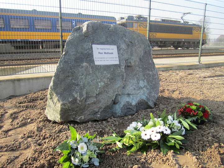 Ter nagedachtenis aan Ron Molhoek. Hij verongelukte op 2 november 2009 bij het werk aan deze onderdoorgang.