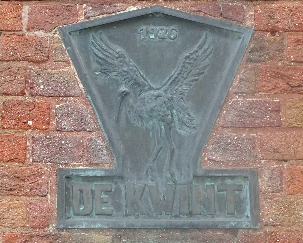 De steen stelt een ooievaar voor, die verwijst naar het beroep van gynaecoloog van de eerste hoofdbewoner, A.J.M. Lamers. Het bijschrift vermeldt het jaartal 1926 en de tekst 'DE KWINT', verwijst naar het aantal gezinsleden.