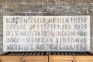 Burgemeester mr. H.J.M. Loeff / opende op 1 september 1955 / dit winkelcentrum ondernomen / door J. Weber en A.J. Wijsman / architect was prof. G.H.M. Holt